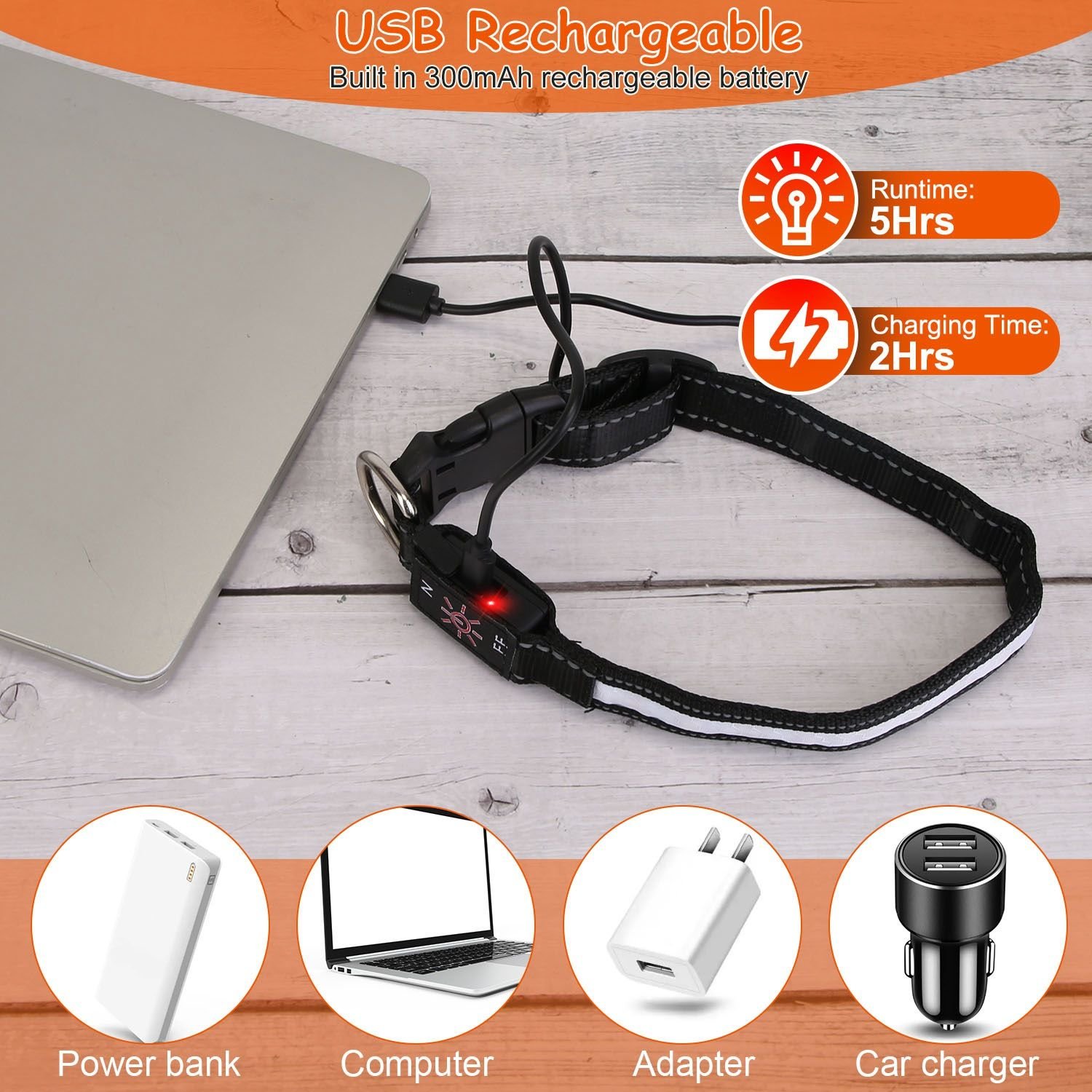 *USB Rechargeable & Long-lasting*:Built in 300mAh rechargeable battery,the dog collar with light is long lasting during use after 2 hours’ fast charging. The USB rechargeable feature also provides much convenience for charging.