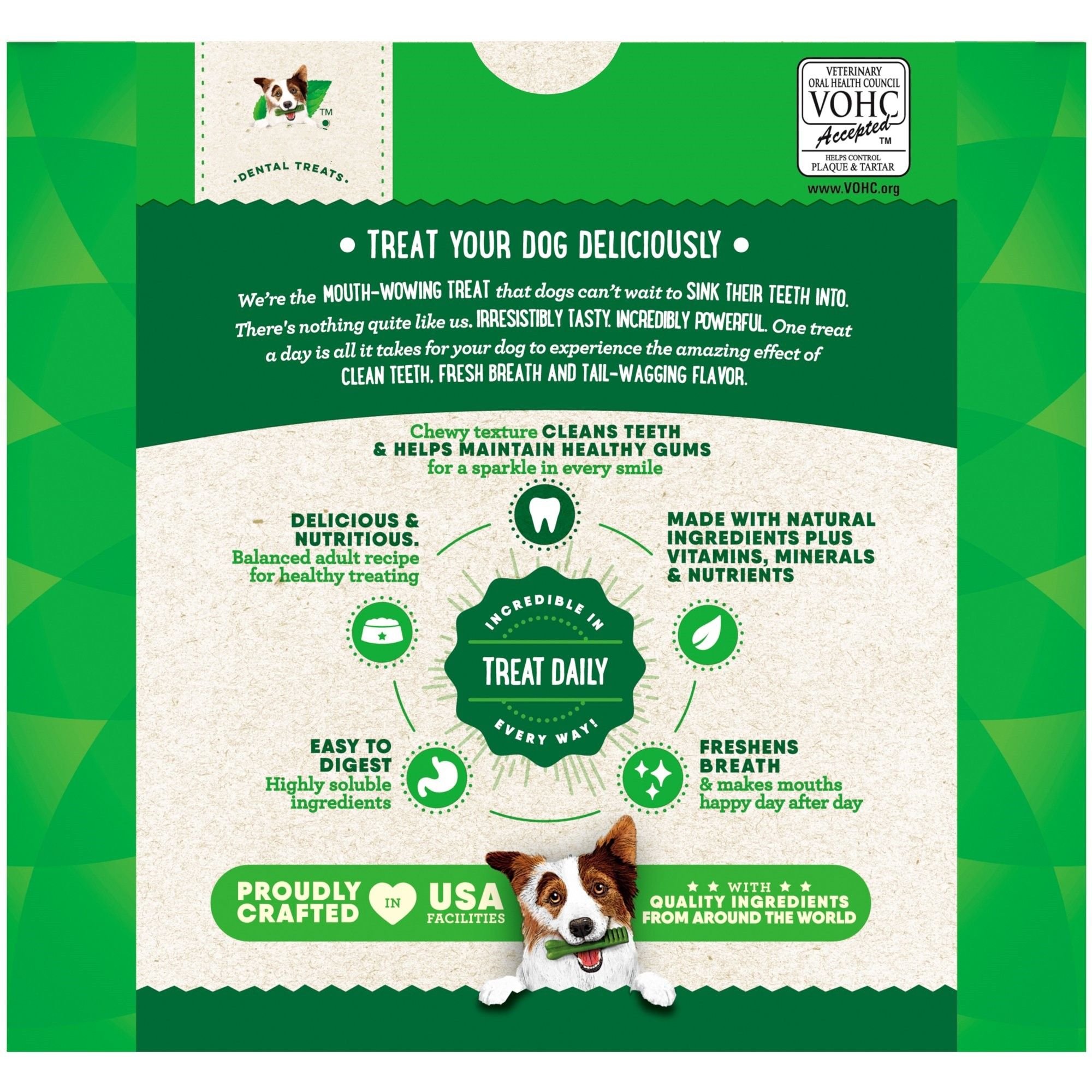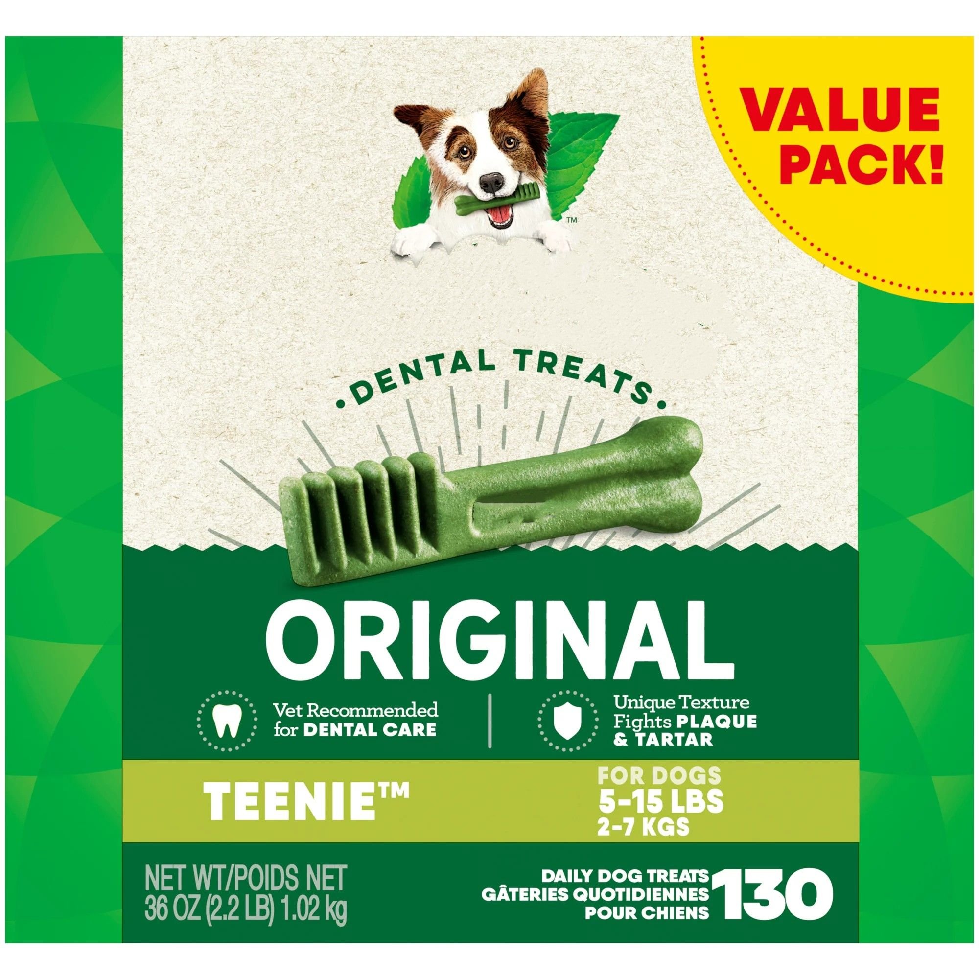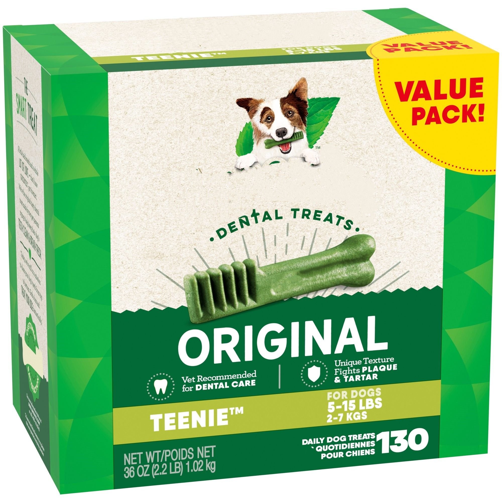 One the Original Dental Treat a day is all it takes for clean teeth; fresh breath; and a happy dog. Your dog can't wait to sink their teeth into these delicious; original-flavor dental dog breath chews because they feature a delightfully chewy texture that fights plaque and tartar. Irresistibly tasty and incredibly powerful; GREENIES Treats for Dogs are vet-recommended for at-home oral health care and accepted by the VOHC (Veterinary Oral Health Council.) Best of all; these natural dog breath treats are made with highly soluble ingredients that are safe and easy to digest. Give your dog the mouth-wowing treat that helps promote their overall health with The Dog Treats. Great for small breeds and little dogs between 5 and 15 lbs. Natural Dog Treats Plus Vitamins; Minerals; and Other Nutrients.