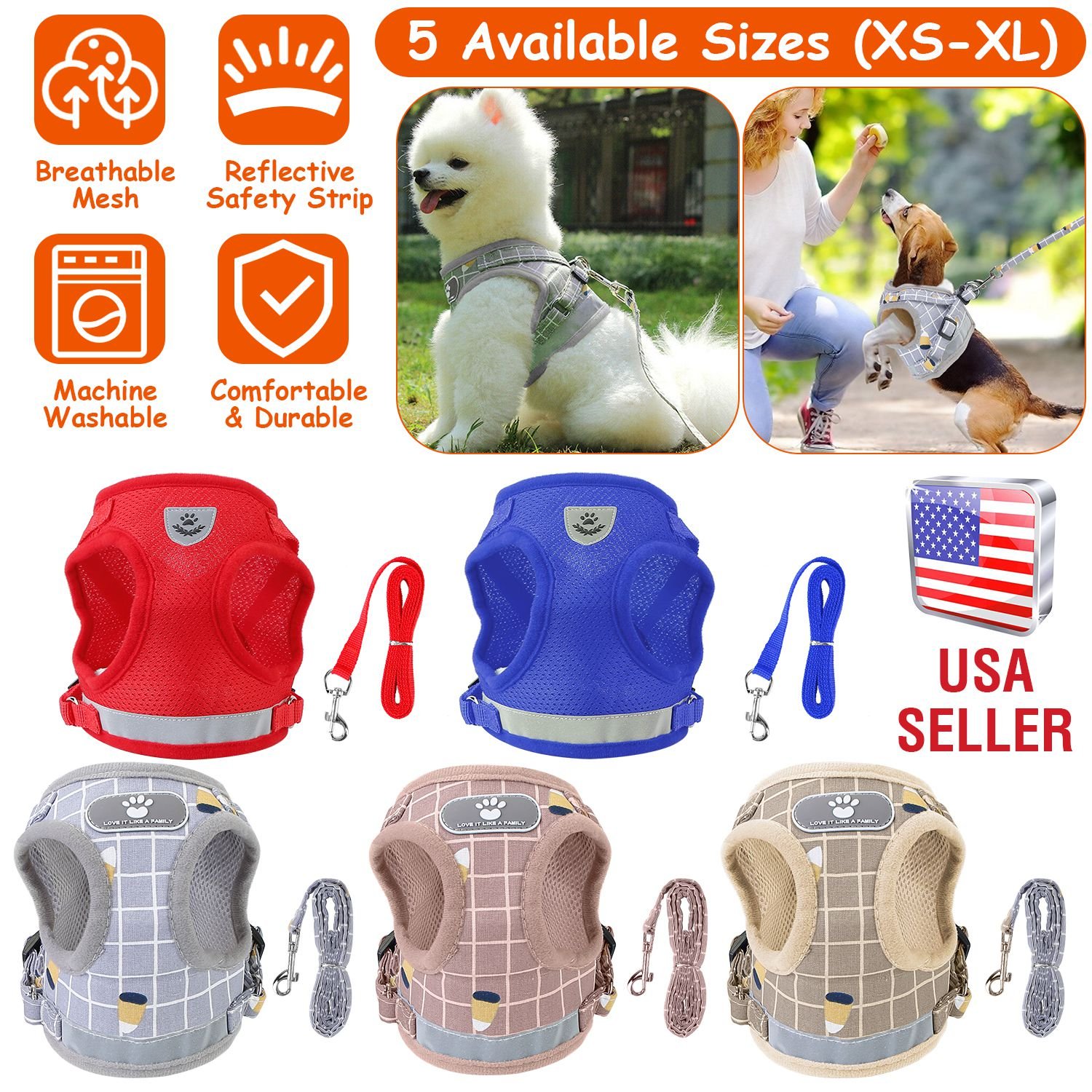 Made of 100% polyester with soft edges and breathable mesh padding, come with adjustable harness and paste strip, our pet chest strap can provide extra comfort and protection. A long reflective strap makes your dog more visible and safe in dark, great for going out at night. 360° Rotatable clasp and 3.94ft leash allow your dog to play outside with freedom. Five sizes and colors are provided for more choices.